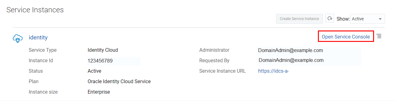 - Ensure that the Administrator field of the identity service instance displays the administrator name that you have credentials for. (DomainAdmin for this tutorial.)