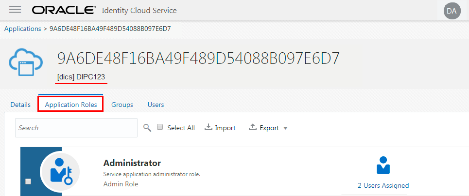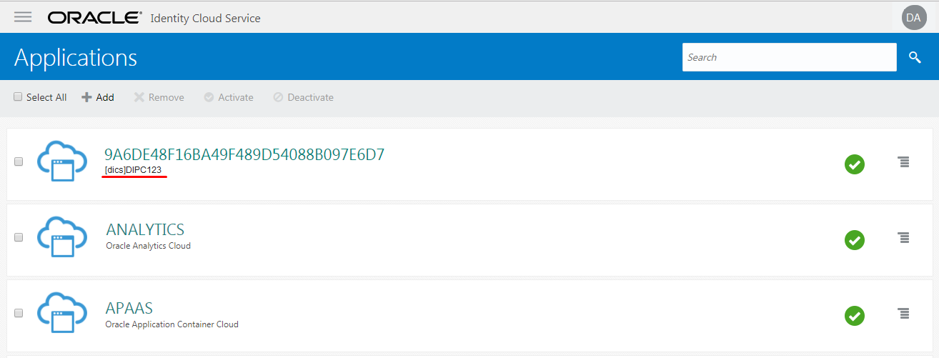 - Click the application called DICS. This application is the entire Data Integration Platform Cloud application added to this Identity Cloud Service instance. (All the applications in your identity domain are listed here. At this moment the abbreviated service type for Data Integration Platform Cloud is labeled as DICS.)