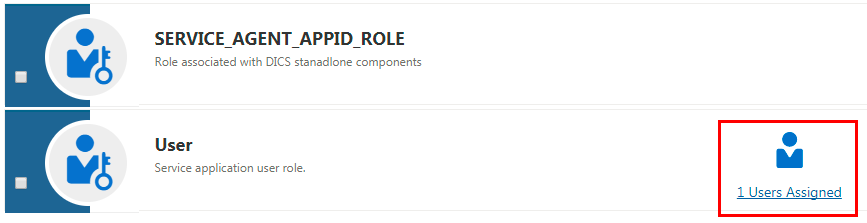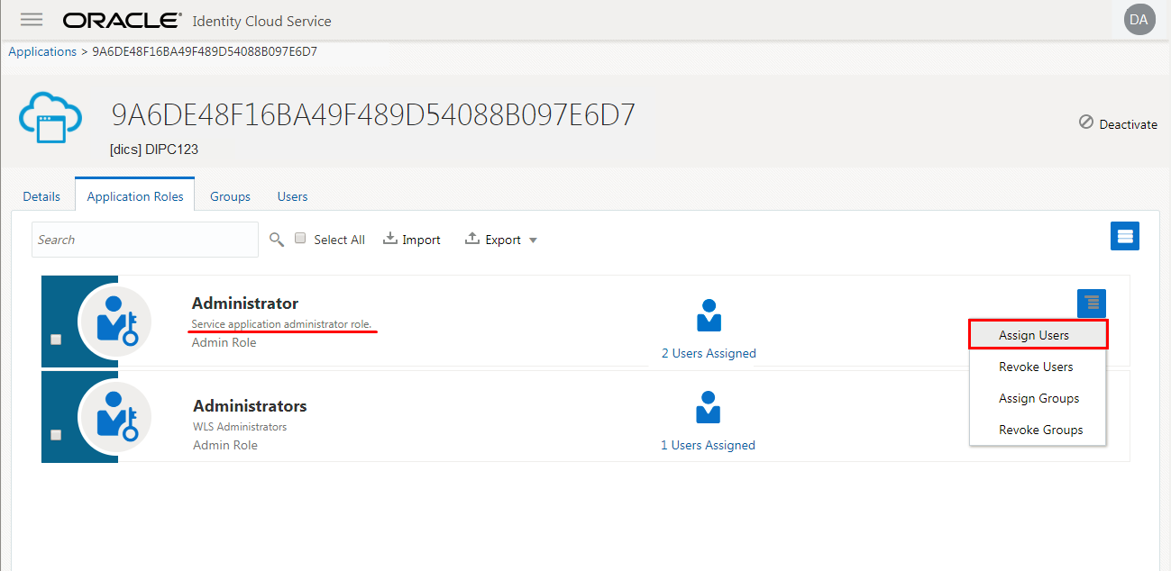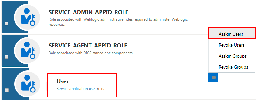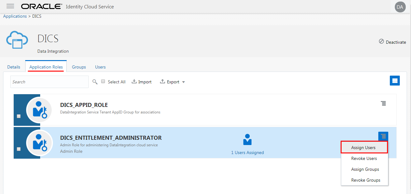 - Click Assign Users in the action menu for DICS_ENTITLEMENT_ADMINSTRATOR role. With this role. you get administrative rights at the service level for DIPC and you can manage all the service instances from the DIPC console.