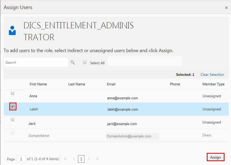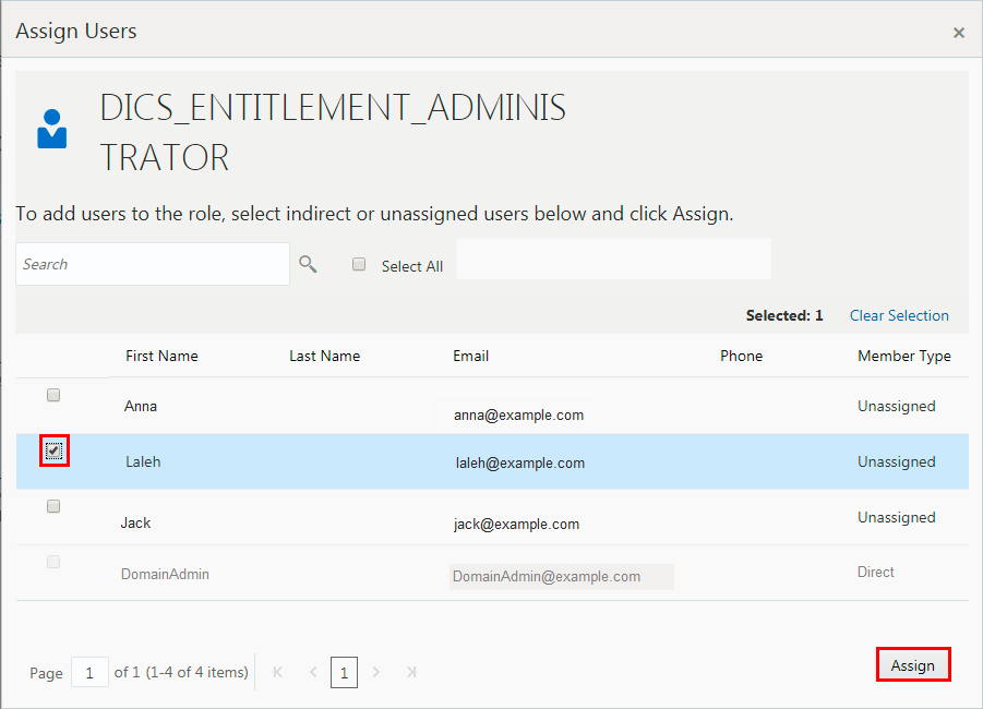 - Select Laleh and then click Assign. (Now Laleh has the administrator role for all DIPC applications, but that does not include other applications such as Database Cloud Service.)