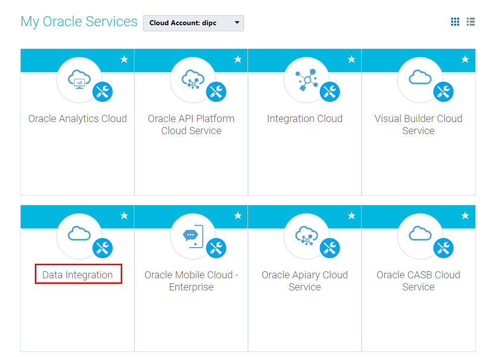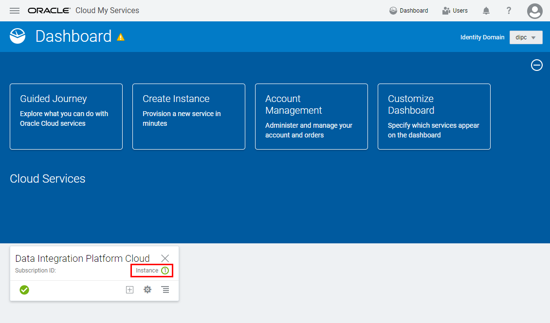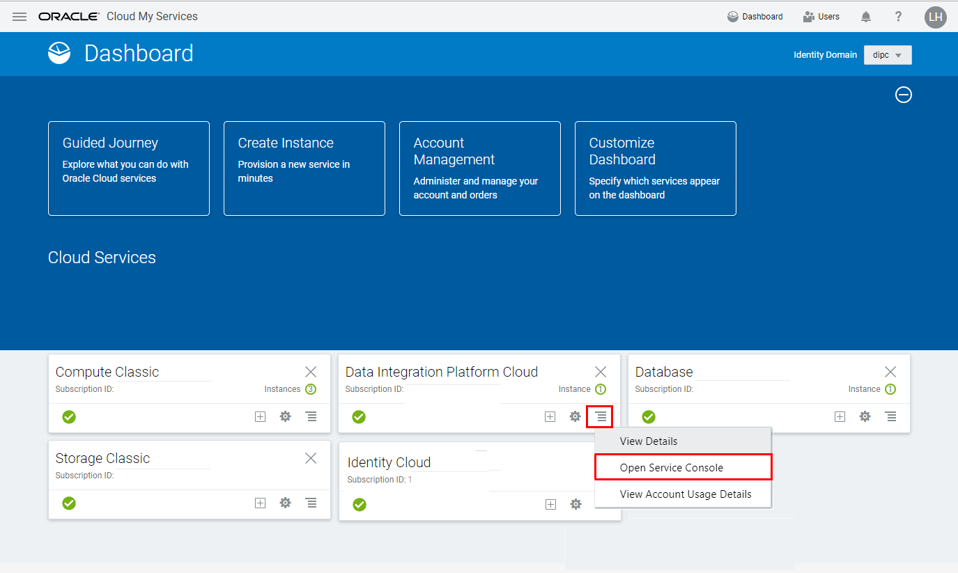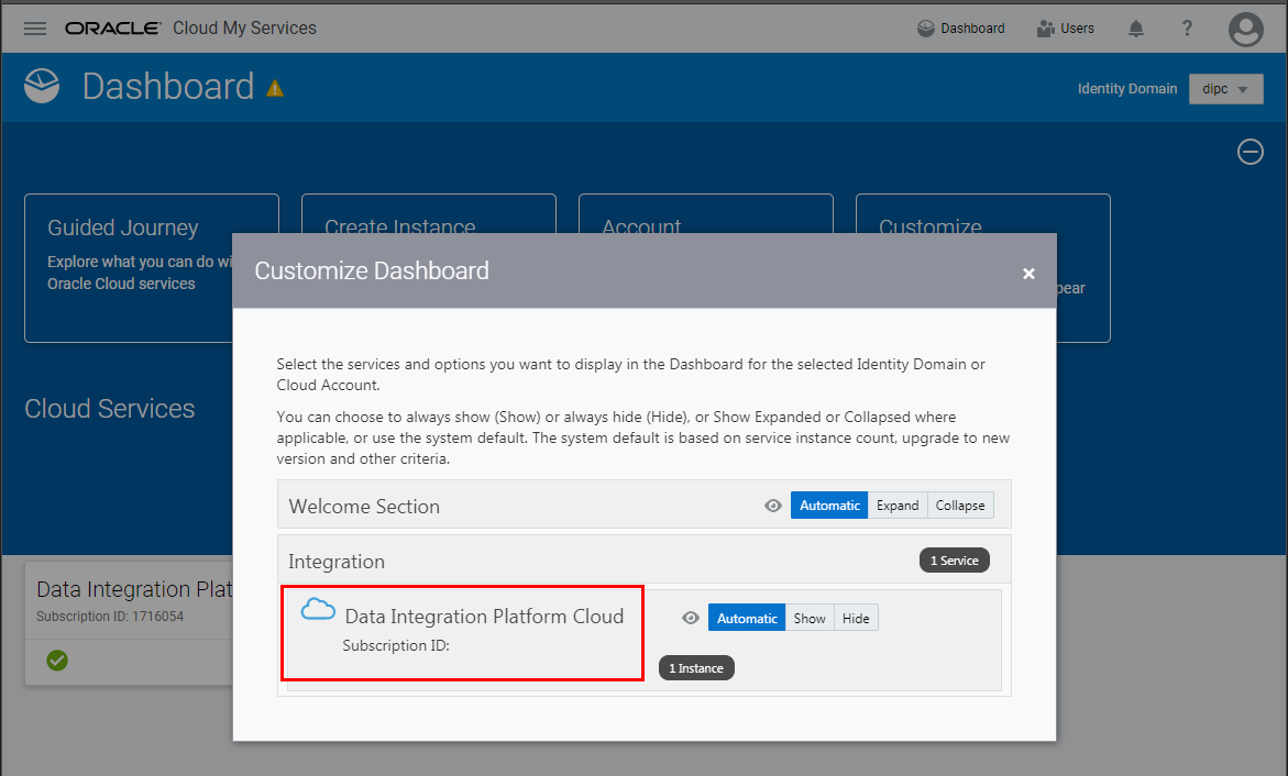 - If there's no Data Integration tile in the Cloud Services section, then use the Customize Dashboard to display this tile. (The Data Integration tile should be displayed already for Laleh, because there's at least one service instance created with this service, DIPC123.