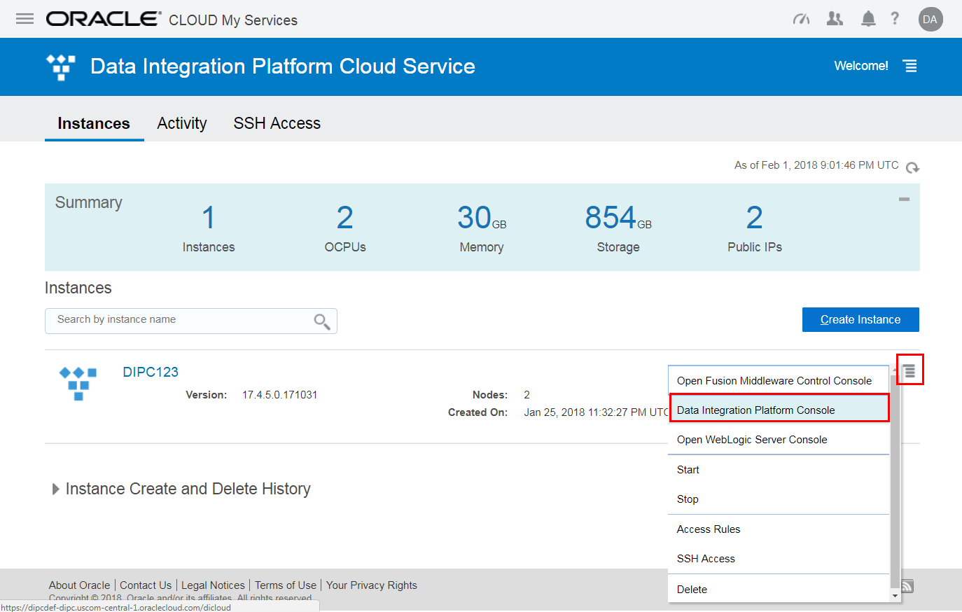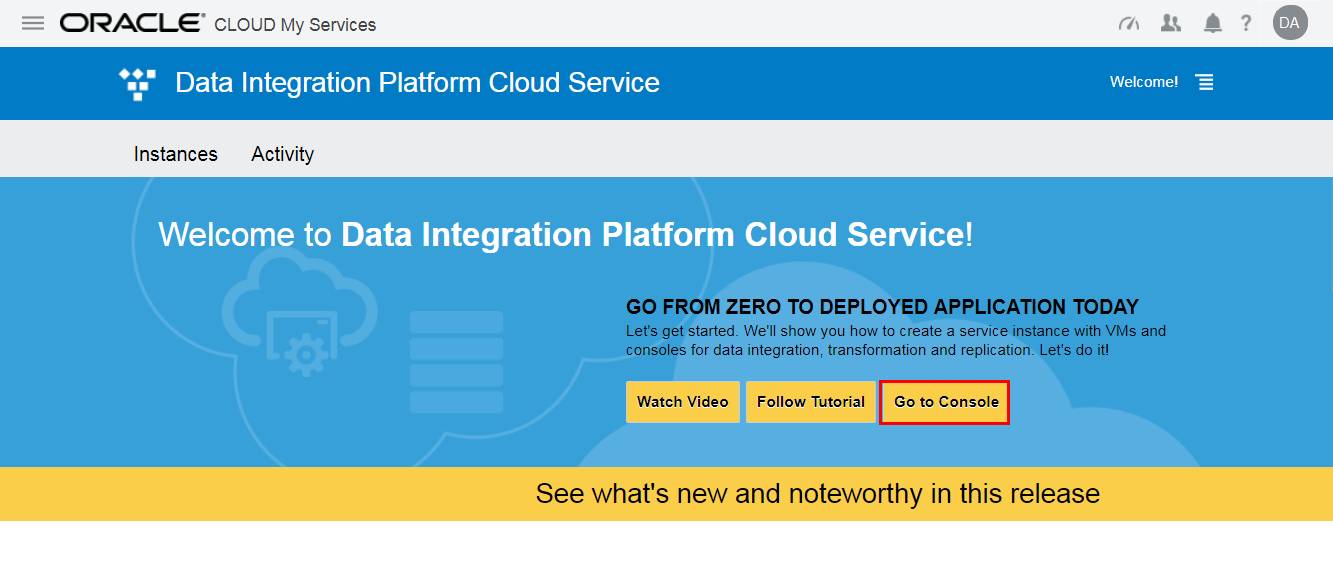 - From the DIPC123 instance, access the Data Integration Platform console.