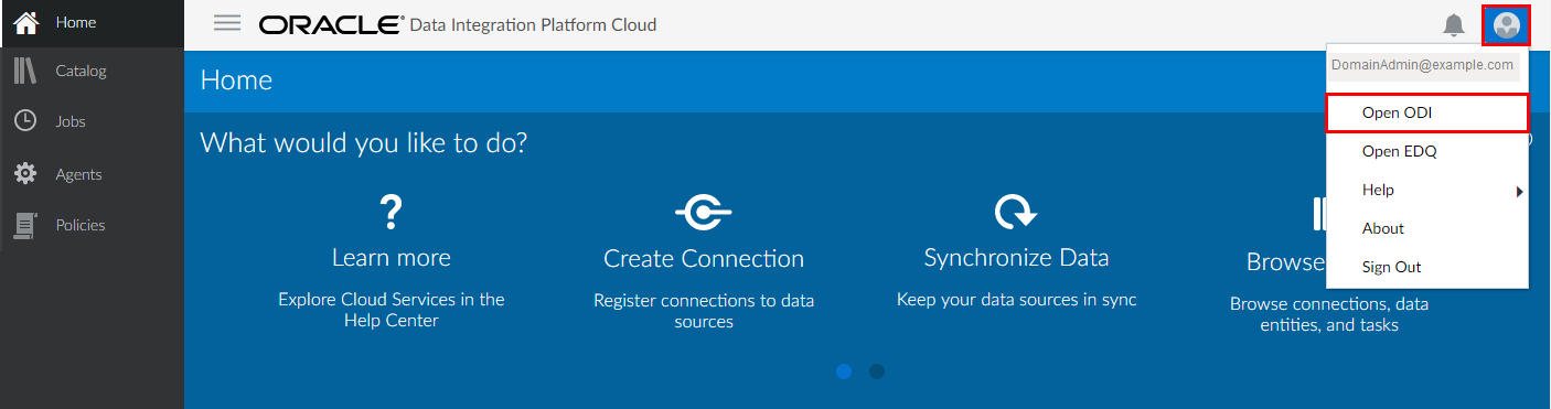 - From the user menu, click Open ODI.