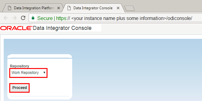- Log in as user Laleh, to the Data Integrator console with the URL provided by the admin user, pasted in the previous section. (https://<your instance name plus some information>/odiconsole/)