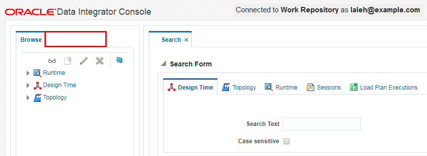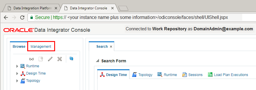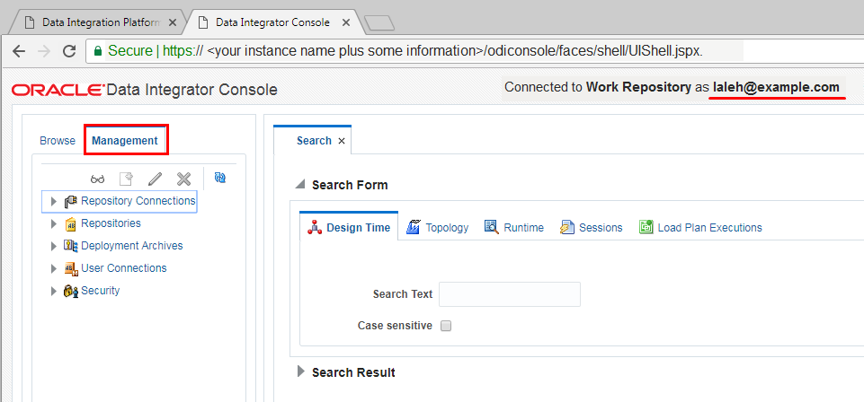 Description of the illustration Section8_15.png - Observe that Laleh, now can access the ODI console, and also has the management tab available to her.