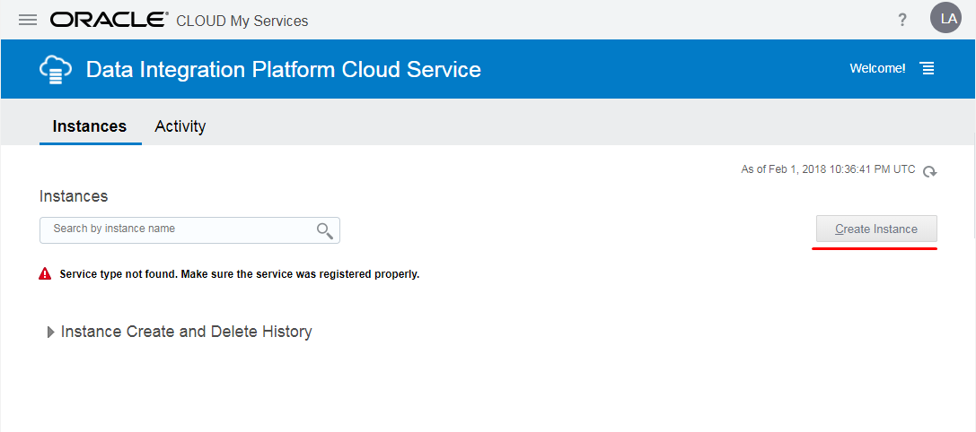 - Observe that the user Laleh doesn't have the list of instances such as the DIPC123 in the list of services, and the Create Service button is disabled. Therefore, Laleh with the User role can't access the Data Integrator Console from here and she doesn't have any rights at the service instance level.