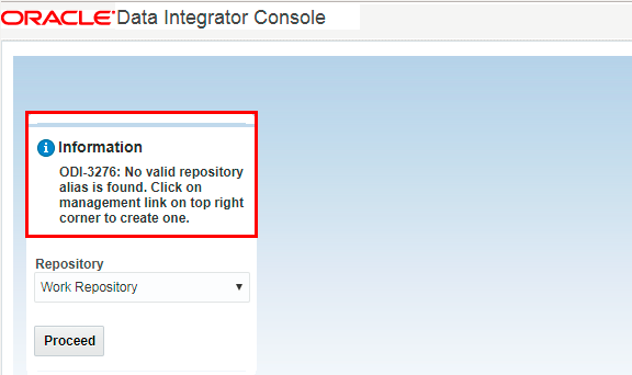 - Observe that even though you log in to ODI console, you don't have access to the repositories that ODI is connected to. (You're not assigned any application roles.)