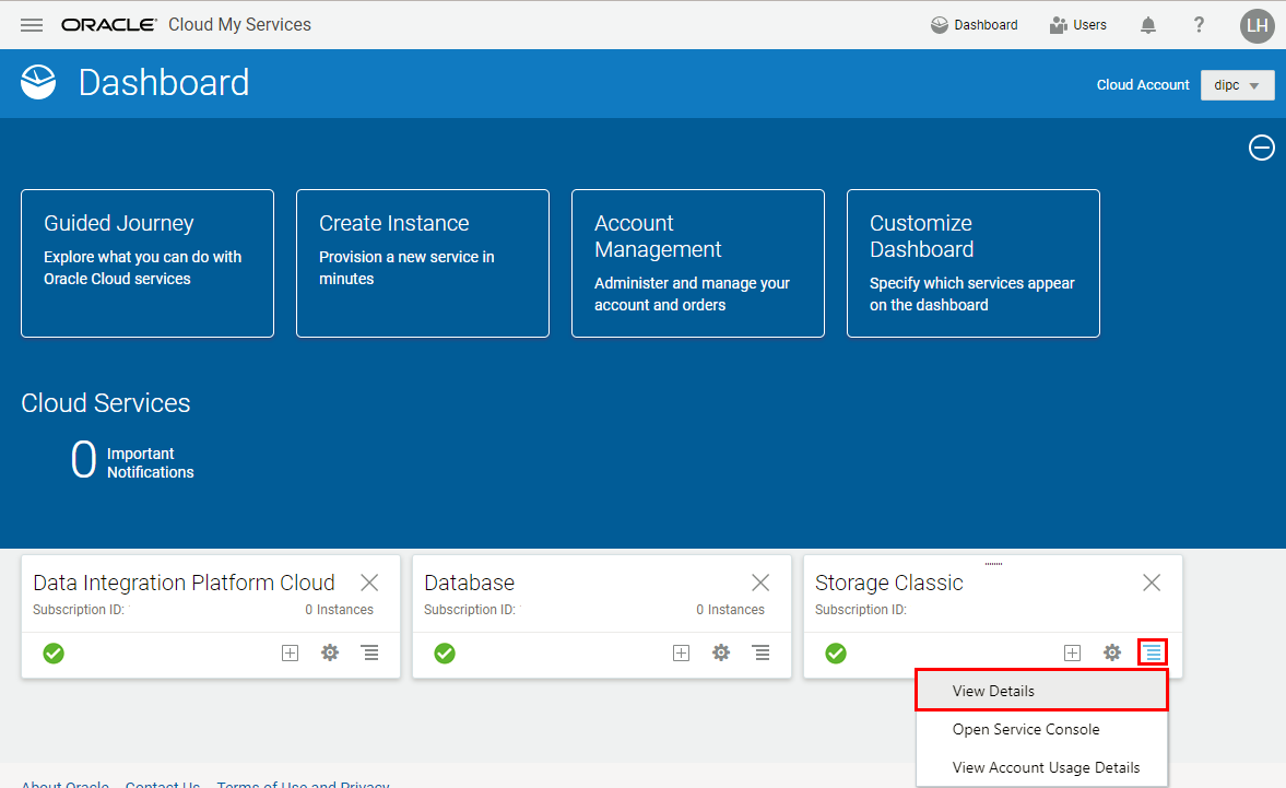 Example:https://dipc.storage.oraclecloud.com/v1/Storage-dipc/dbcsDEF - Username: Enter the username for My Services which applies to Storage Classic, Database and Data Integration Platform Cloud. If you don't know it, refer to the What Do You Need section of this tutorial.