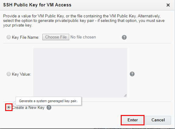 - In the SSH Public Key for VM Access dialog, select Create a New Key, then click Enter.