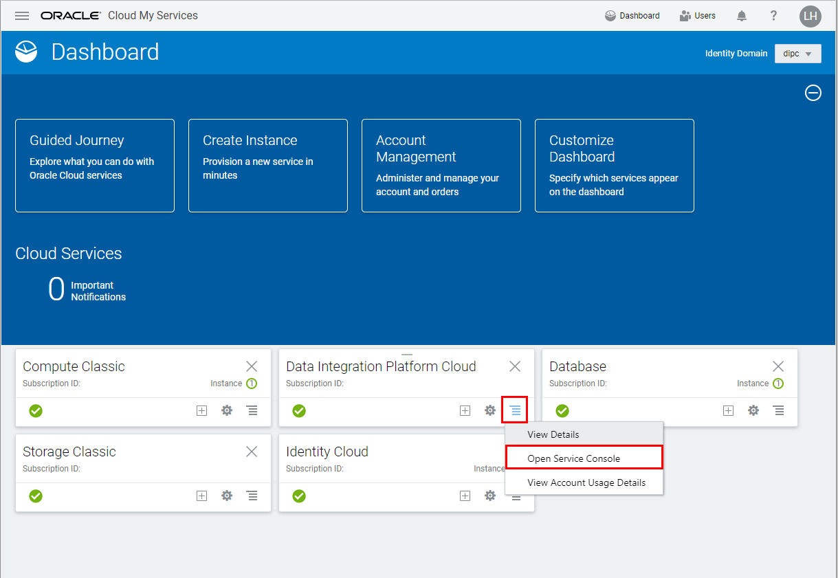 - Locate Data Integration Platform Cloud in My Services dashboard and, then select Open Service Console from the Actions menu.