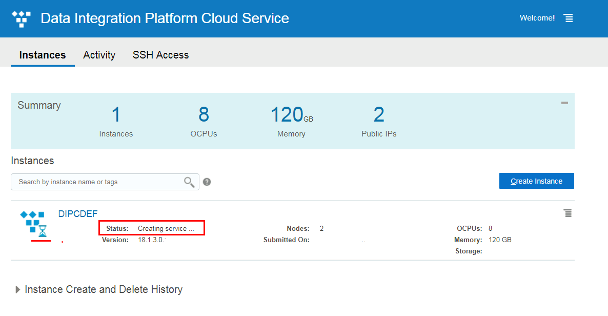 - In the Instances page, confirm that the DIPCDEF instance appears in the list of instances with the Status displayed as: Creating service....