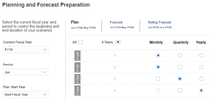 - In the Planning and Forecast Preparation dialog box, for Plan, make the following selections: