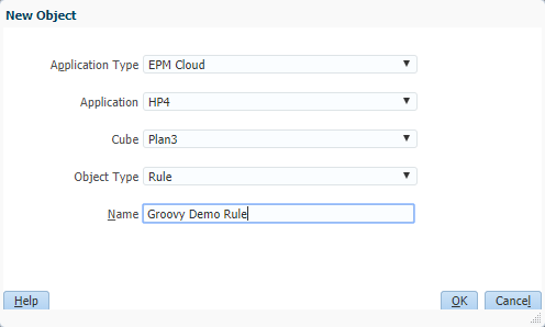 - In Calculation Manager, select Actions, and then select New Object. In the dialog box, select an application type, application, and cube. For Object Type, select Rule. Enter a name for the rule, and then click OK.