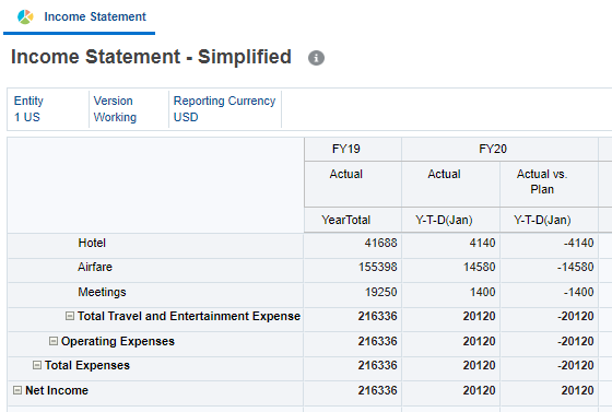 The Income Statement tab includes data from the Actual and Plan scenarios. The accounts displayed are from the chart of accounts that was previously loaded.