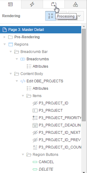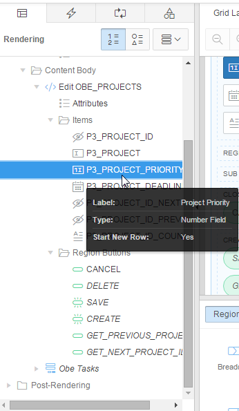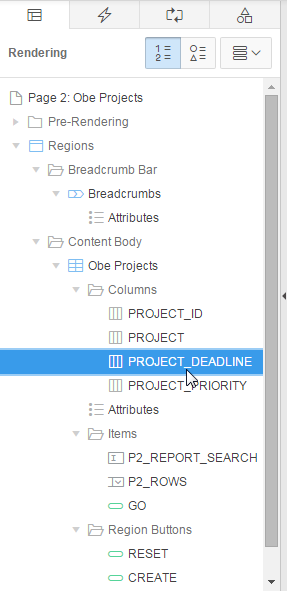 In the Rendering tab, select P3_PROJECT_PRIORITY under Columns in the Edit OBE_PROJECTS region.