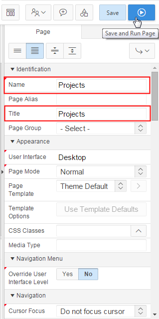 Under Identification, enter Projects for Name and Title. Click the Save and Run Page icon.