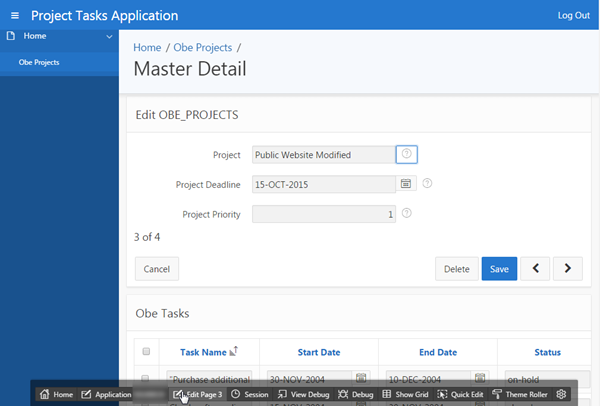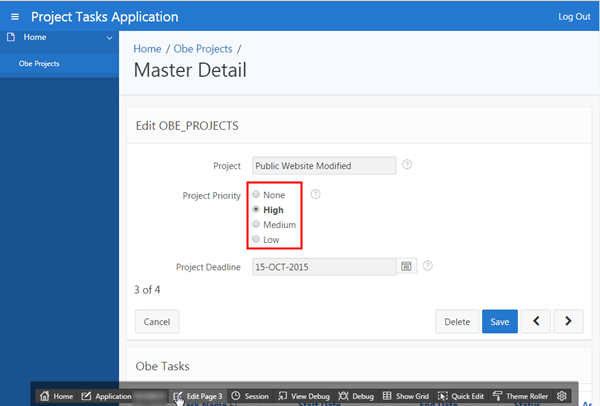 Notice that Project Priority appears before Project Deadline in the Master Detail page. Click the Application<n> link in the developer toolbar.