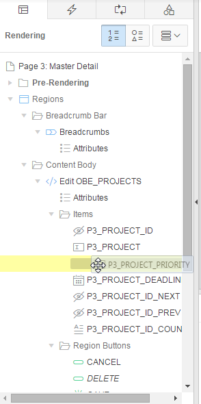 To reorder the sequencing of items in this page, you can drag and drop an item to a new location under the Rendering tab or in the Grid Layout. Drag the P3_PROJECT_ PRIORITY item and drop it above the P3_PROJECT_ DEADLINE item in the Rendering tab.
