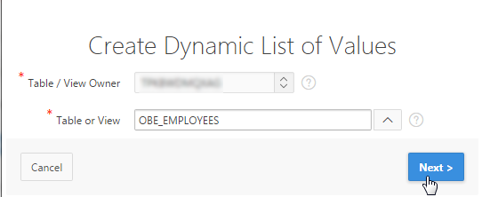 The Create Dynamic List of Values dialog window appears. Click the List of Values icon for Table or View.