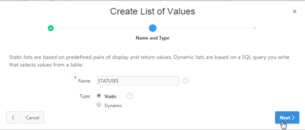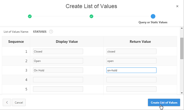 Enter the following entries for static values, and click Create List of Values.