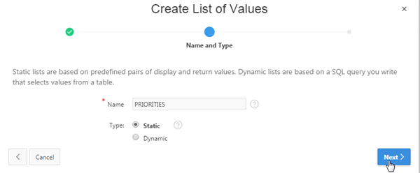 Enter PRIORITIES for Name, select Static for Type, and click Next >.