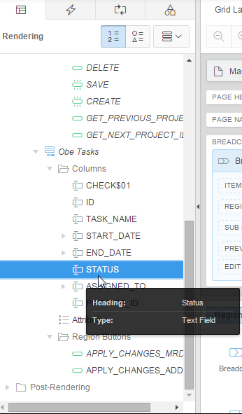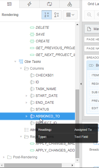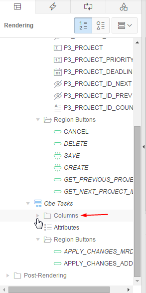 Now you can associate the LOVs with the page. Expand Columns under Obe Tasks in the Rendering tab.