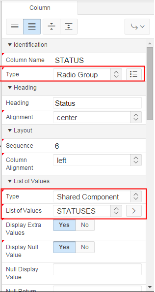 Under Identification, select Radio Group for Type. Under List of Values, select Shared Component for Type and STATUSES for List of Values.