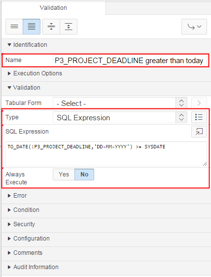 Property Group Property Value Identification Name P3_PROJECT_DEADLINE greater than today Validation Type SQL Expression Validation SQL Expression TO_DATE(:P3_PROJECT_DEADLINE,'DD-MM-YYYY') >= SYSDATEValidation Always Execute No