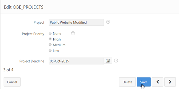 Although the Master-Detail form is fully functional, the presentation can be improved. In this topic, you change the names of the Page Title, Region Title, and change the format of an item on the Master Report. Lastly, you change the sequence of items in the Projects and Tasks page using the Drag and Drop feature. Perform the following steps: