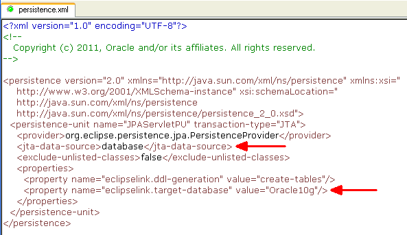 Change the generic value inside the <jta-data-source> tag to the name of the Database Cloud Service that was provisioned along with your Java Cloud Service. In this tutorial, the Database Service name is database.