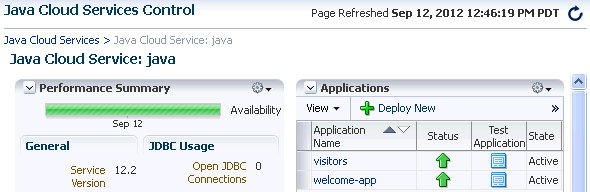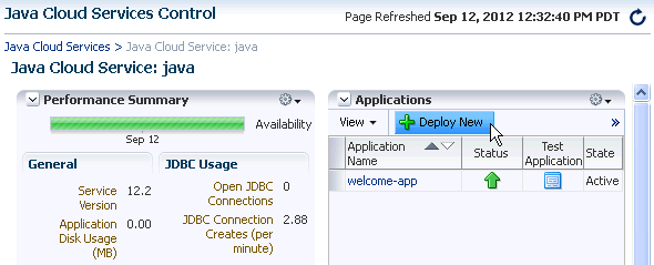 After signing in, you should see the Java Cloud Services Control console for your Java Cloud Service. To deploy an application, below the Applications heading, click the Deploy New button.