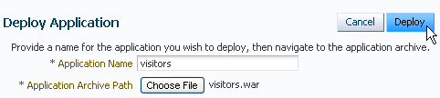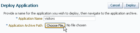 On the Deploy Application screen, enter visitors in the Application Name field, and click the Choose File button to browse the file system for the application archive file.