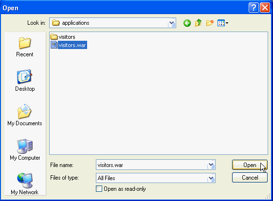 Browse to the location of the new visitors.war file that you just created. This is the one that has the updated deployment descriptor. Select this file and click Open.