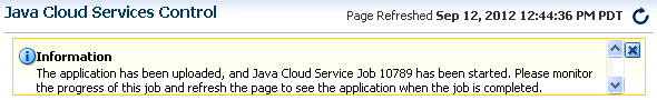 After the file is uploaded, you are returned to the Java Cloud Service screen. Notice the message that the application is uploaded and will be deployed.