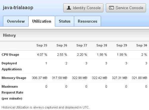 Click the Utilization tab to view a summary of current usage, including CPU Usage, the number of Deployed Applications, Memory Usage, and Maximum Request Rate (per minute). Use this page to monitor the basic health of the service.