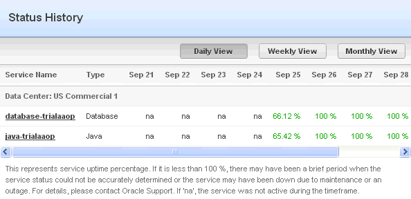 The Status History page displays the uptime percentage of all your services. The information is the same as under the Status tab of a particular service, except that this view lists all your services, and allows you to select the time frame by clicking either the Daily View, Weekly View, or Monthly View buttons.