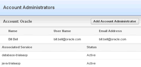 The Account Administrators screen displays the administrators of the account and the services associated with the account. New administrators can be added by clicking the Add Account Administrator button.