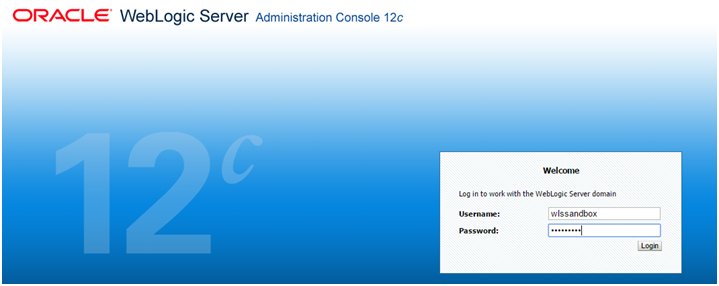 In the WebLogic Server Administration Console login page, use a valid WebLogic Server administrative user name and password to log into the console. You may want to use the WebLogic Administrator username and password that you provided when creating the service instance (for example wlssandbox/Welcome#1).