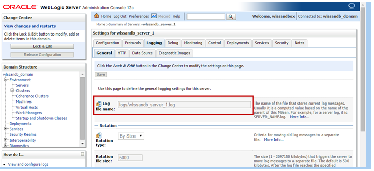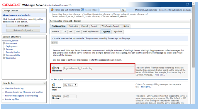 Description of this image The details about the domain log file, including location and rotation properties are presented.