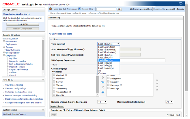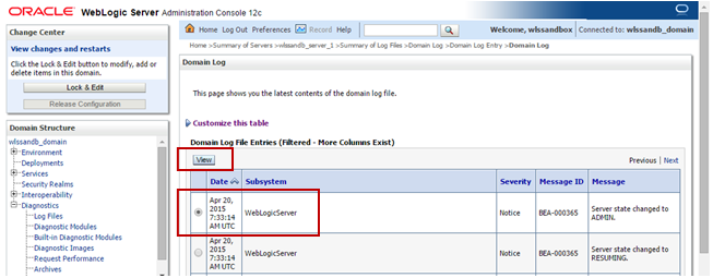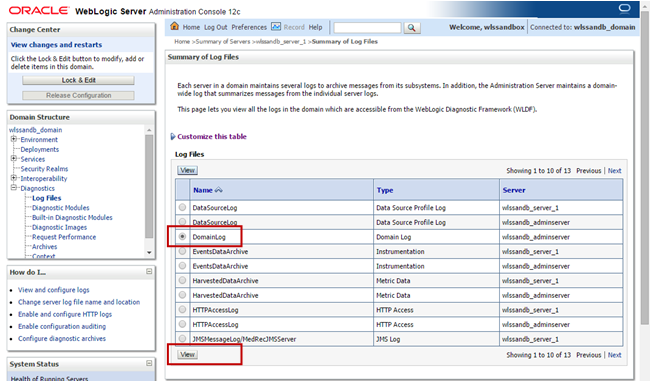 Locate the log file you want to visualize. For example, the one named DomainLog that represents the domain log. Select it by clicking the radio button and click View.