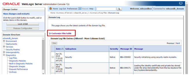 Description of this image Use the Customize this table link to define the time interval, columns displayed and log entries per page.