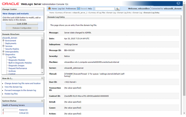 For troubleshooting purposes, you can always access all the different log files that the underlying WebLogic infrastructure create. This tutorial shows how to get access to those log files.