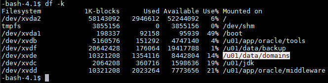 (Alternately for these steps, you can change to: $DOMAIN_HOME/servers/<jcs-server> )df -kcommand to see the list of filesystems./u01/data/domainsis the filesystem where the domain data reside.