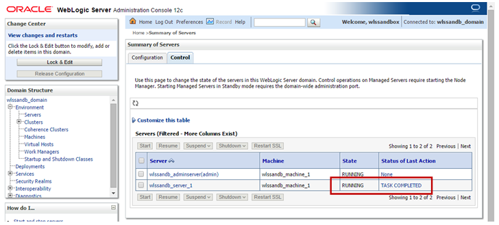 Managed servers can be started using WLST Commands as explained in the section above "Using WLST Commands to Start Server". However, once the admin server has started and the WebLogic Administration Console becomes available it may come in handy to use the web interface to start the managed servers.