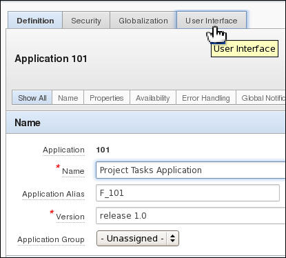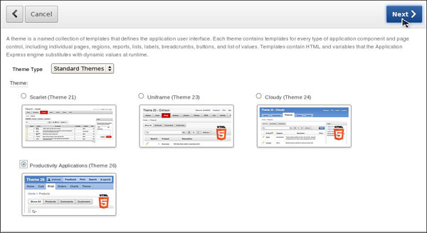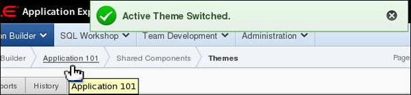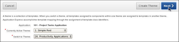 When you created the application, you selected the theme 1. You can change the look and feel of the application by changing the theme. You first create a new theme by selecting one from the Oracle Application Express Repository. To apply a new theme, perform the following steps: