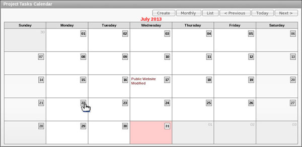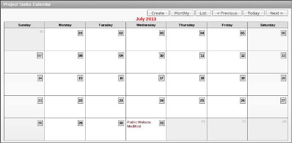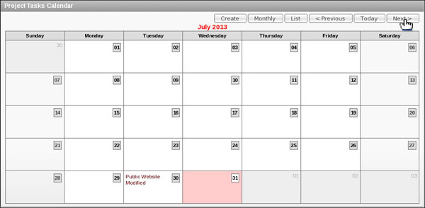 The calendar shows the projects on the date due. Note: If you do not see your tasks in the displayed month, click Next> tab till you see it.