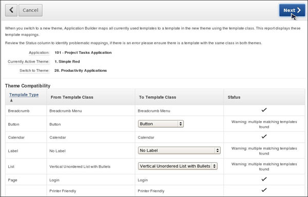Notice that the page displays the compatibility between the two themes. This utility checks whether there is a template in the new theme to replace each of the templates in the current theme. The check marks in the Status column indicate that the templates are compatible.