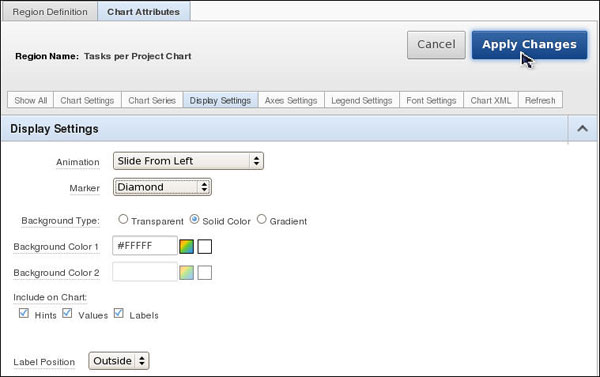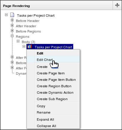 In the Page Rendering section, under Regions, locate Tasks per Project Chart. Right-click Tasks per Project Chart and select Edit Chart.