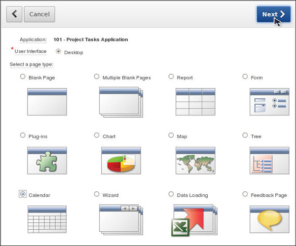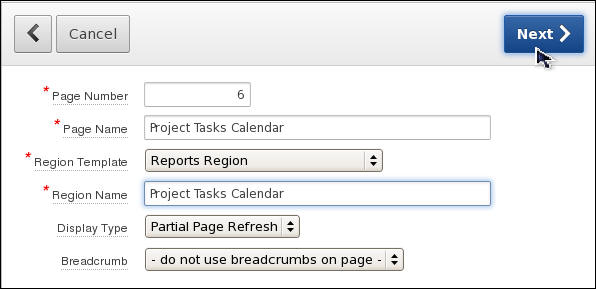 Enter Project Tasks Calendar for the Page Name and Region Name. Then, click Next >.