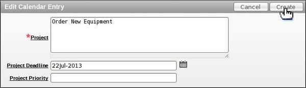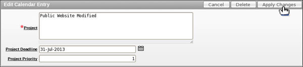 The Edit Calendar Entry window is displayed. Change the name to something else and change the Project Deadline to one day greater than the current date of the project. Click Apply Changes.